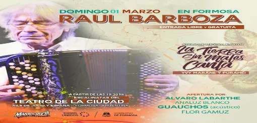 El embajador internacional del chamamé y reconocido renovador del género Raúl Barboza vuelve a Formosa con un concierto en las escalinatas del Teatro de la Ciudad, ubicado en la intersección de la avenida 9 de Julio y España el próximo domingo 1 de marzo, a las 19.30 hs, con entrada libre y gratuita, así lo comento en Radio Nacional Marcos Ramírez, productor y gestor cultural del recital. AUDIO