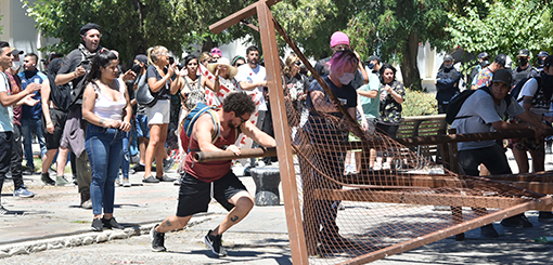Los manifestantes de Rawson y otras ciudades lograron superar las vallas de contención que ubicó la policía en las ochavas y, una vez que ingresaron a la peatonal que separa la Casa de Gobierno de la residencia del gobernador Mariano Arcioni, comenzaron los destrozos contra la estructura del edificio y un incendio generalizado que obligó a la intervención de los bomberos.