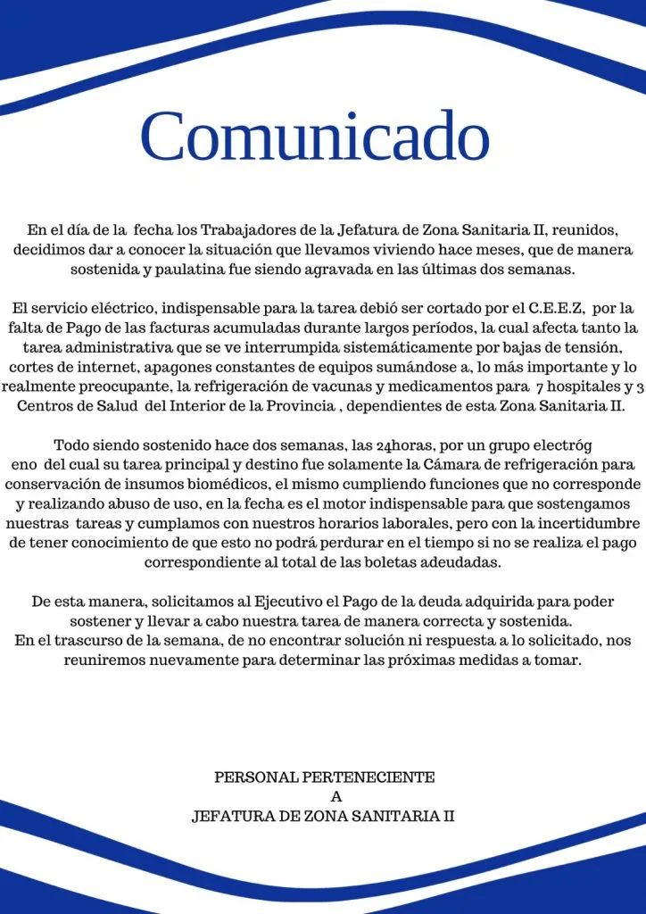 La médica pediatra e integrante de SIPROSAPUNE, Carola Chávez, se refirió al corte del servicio de energía eléctrica en Zona Sanitaria II. "Seguimos preocupados, como SiProSaPuNe (Sindicato de Profesionales de la Salud Pública de Neuquén) seguimos denunciando la falta de coberturas, el déficit de insumos por especialidades, los medicamentos de pacientes crónicos y la falta de pago a proveedores, hace un tiempo no teníamos insumos para hacer HIV", contó.