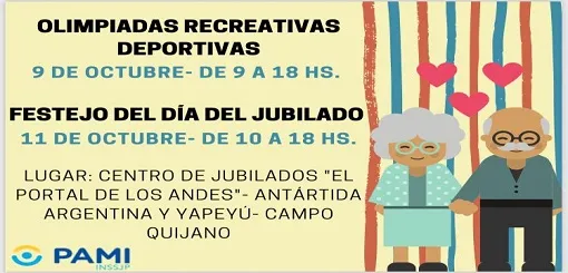 El 9 y el 11 de octubre Campo Quijano recibirá a todos los jubilados que deseen participar de las Olimpíadas Recreativas Deportivas que organiza el Pami. La actividad será en el Centro de Jubilados "El Portal de los Andes", ubicado en la intersección de las calles Ejército de los Andes y Yapeyú, de esa ciudad.