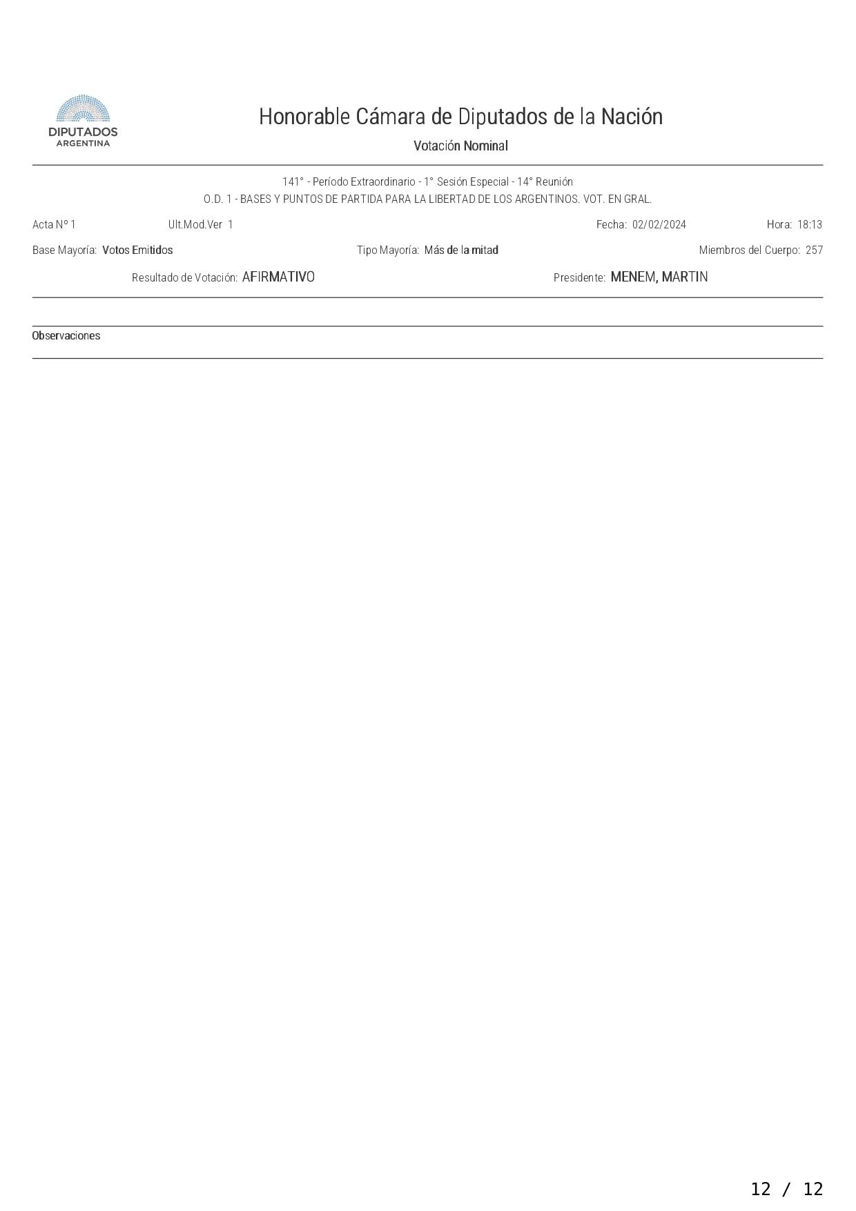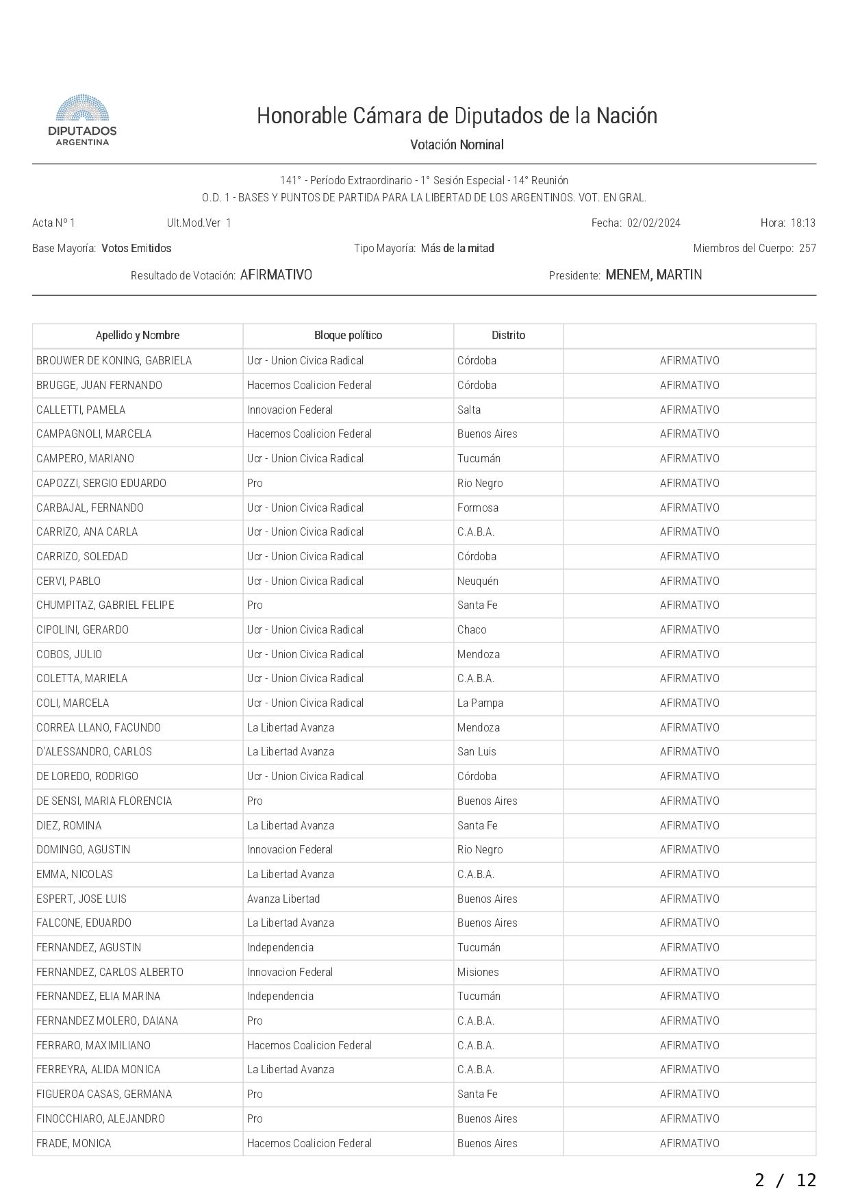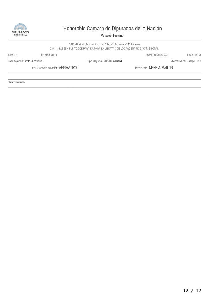 La Cámara de Diputados aprobó en general por 144 votos contra 109 el proyecto de ley "Bases y Principios para la Libertad de los Argentinos", que establece una emergencia pública, una reforma del Estado y la privatización de varias empresas públicas, y pasó a cuarto intermedio hasta el martes próximo a las 14 para el tratamiento de la iniciativa artículo por artículo.