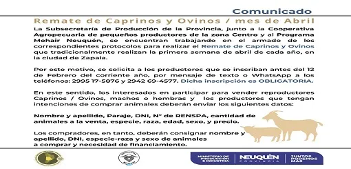 La Subsecretaria de Producción Ing Agronoma Amalia Sapag invito a la Feria Integral de la Producción en Zapala el 10 de abril 2021, recordó que dentro del contexto de pandemia que estamos atravesando se ha priorizado la compra y venta de reproductores para el mejoramiento genético, la feria dará comienzo el 10 de abril, para mayor información pueden dirigirse a calle Elena de la Vega 472 tel 02942-430028 .También destaco que esta vigente el Incentivo ganadero que está destinado a incentivar la producción y su calidad en la ganadería bovina, ovino-caprina y porcina mediante la asignación de recursos diferenciales, según los esfuerzos y resultados en términos de productividad y calidad de cada productor, profundizando los logros alcanzados en las tres primeras fases del programa y potenciando la dinámica productiva del sector ganadero hasta la auto sustentabilidad.