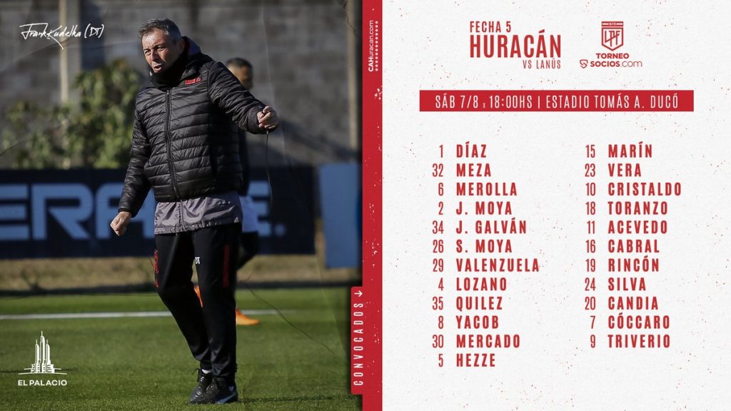 El entrenador de Huracán Frank Darío Kudelka no podrá contar con Walter Pérez y Leandro Grimi  lesionados, y César Ibañez  que fue expulsado ante River. Otro que se encuentra en duda es Hezze por un esguince de tobillo.