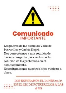 Dos escuelas de Potrerillos no tienen clases presenciales desde el pasado 11 de mayo por la explosión de la caldera del establecimiento educativo de Valle de Potrerillos. Por ello, los padres y las madres reclaman una solución urgente para que los niños y las niñas vuelvan al establecimiento ya que es complicado la educación on line por la conectividad de la zona.