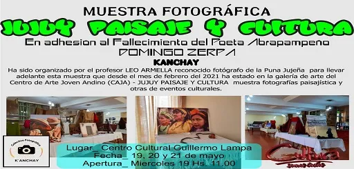 En conmemoración de un nuevo aniversario del fallecimiento del poeta puneño Domingo Zerpa un colectivo de fotógrafos realizará una muestra los próximos tres días en la ciudad de Abra Pampa. Para contarnos mas acerca de este evento desde la Radio Pública nos comunicamos con Leo Armella: “En adhesión a las actividades por el aniversario del fallecimiento de Domingo Zerpa nosotros también quisimos como colectivo de fotógrafos traer a Abra Pampa esta muestra de fotografía que se llama ‘Jujuy Paisaje y Cultura’. Que es una colección podríamos decirle ya de fotografías que de alguna forma tratan de hacernos conocer los paisajes de toda nuestra provincia. Paisajes de la puna, de la quebrada, de los valles y especialmente esta muestra se caracteriza también por darnos a conocer la cultura de Jujuy (…) poder conocer como se manifiesta el hombre y la mujer de la quebrada, de los valles"