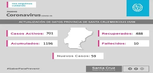 Santa Cruz registra un total de 1196 casos positivos desde el inicio de la pandemia: 701 activos, 488 pacientes recibieron el alta y 10 fallecieron (9 Río Gallegos, 1 San Julián).