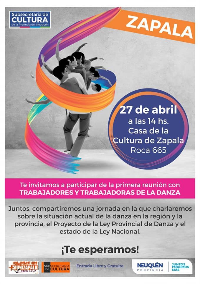 El subsecretario de cultura de Zapala, Lucas Godoy, informó sobre la actividad que organizan en conjunto con la Subsecretaría de Cultura provincial con motivo de festejarse el Día Internacional de la Danza. El 27, a las 14, se hará una reunión de trabajadores y trabajadoras de la danza en la casa de la Cultura. La temática de la reunión será debatir sobre "el estado de la danza en la región y los proyectos de ley provincial y nacional de la danza".